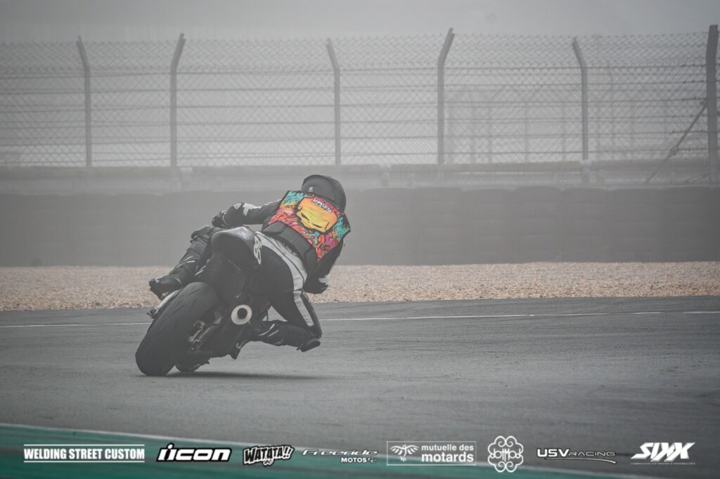 H-2h, 10h, on part. les motos marchent bien, mais le brouillard rend la course très difficile. Buée dans la visière, eau dessus… On y va au talent, mais on se chie dessus !