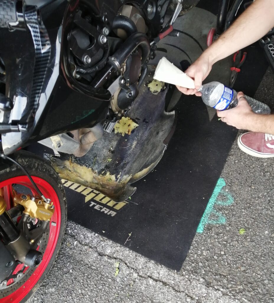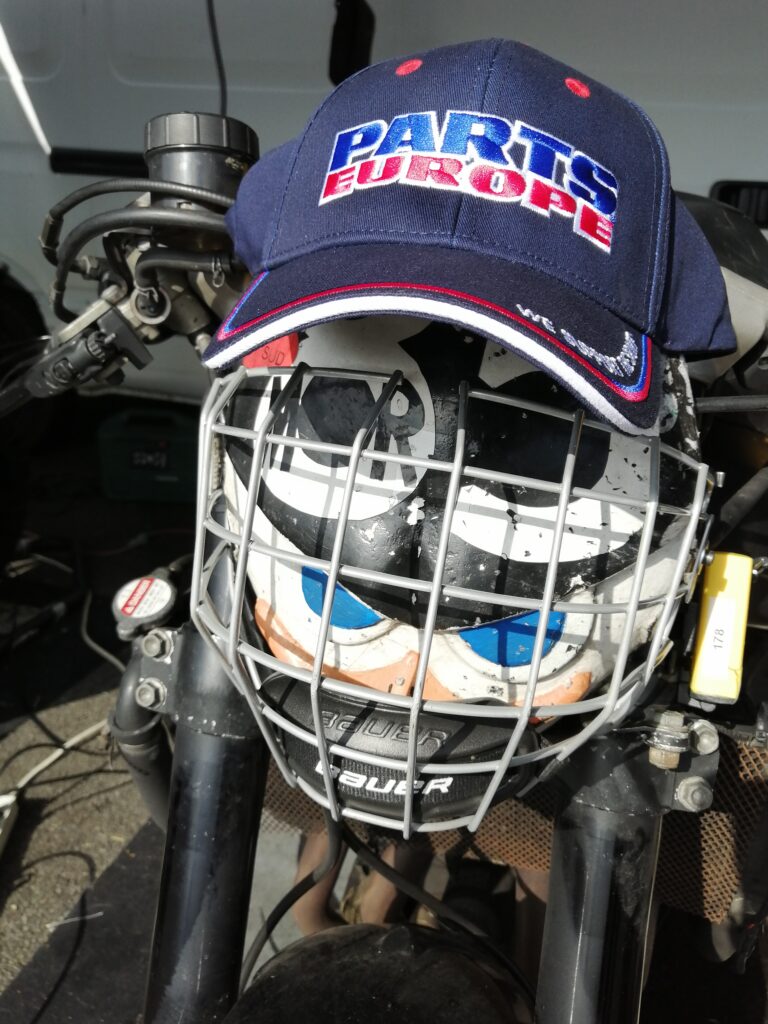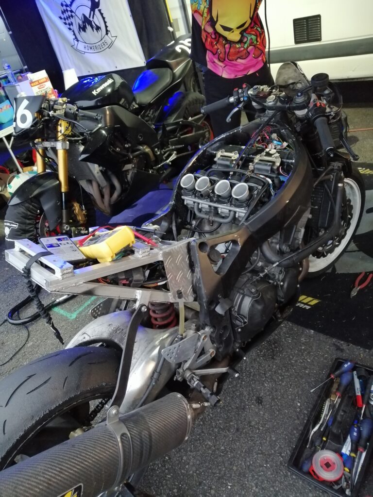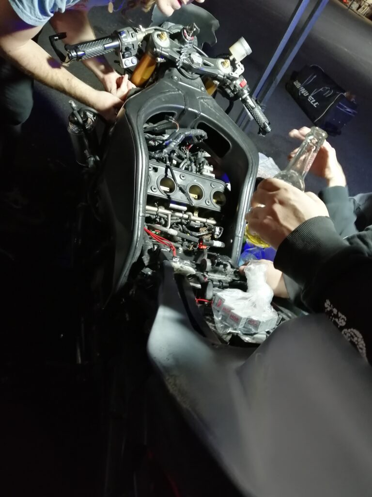 H-48h50m session chez les lents, rentrée en piste, sortie directe, la CBR broute encore plus. Ossamoual se détend peu à peu et fait le drapeau accroché au guidon de sa monture ! C’est que ça marche une ZX10 (quand c’est pas en panne) !. Nettoyage de la rampe de carbus de la Honda (on croise les doigts pour que ce soit ça, c’est compliqué de reproduire les conditions de broutage dans les paddocks et même sur route…) pendant que d’Ossamoual peint sa coque à côté… DANS LE RESPECT DES SAINTES ECRITURES. S’en suit le freinage des vis, l’enfouissement des mousses de réservoir (dont La Taupe a déjà piqué la moitié)