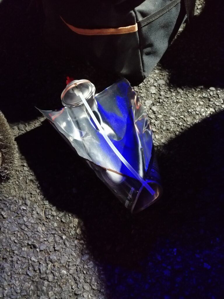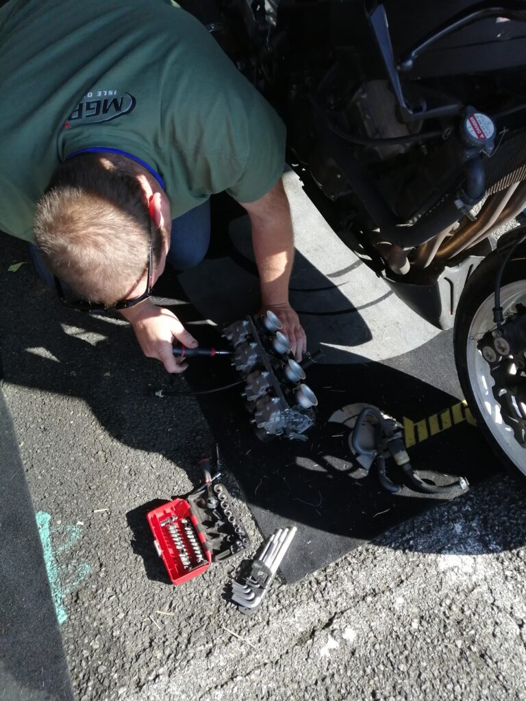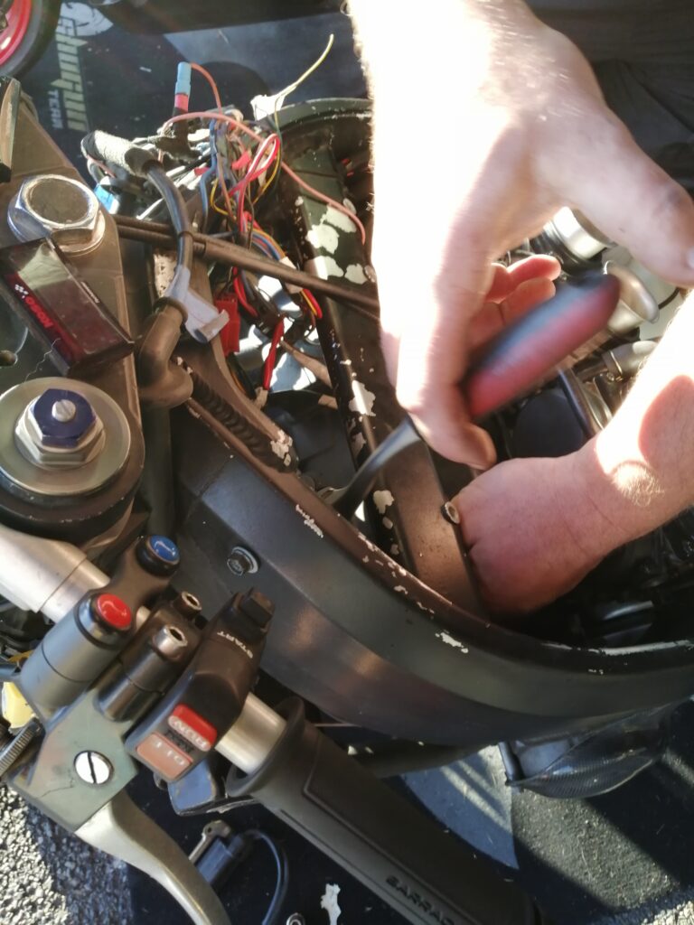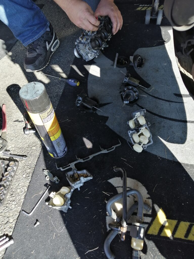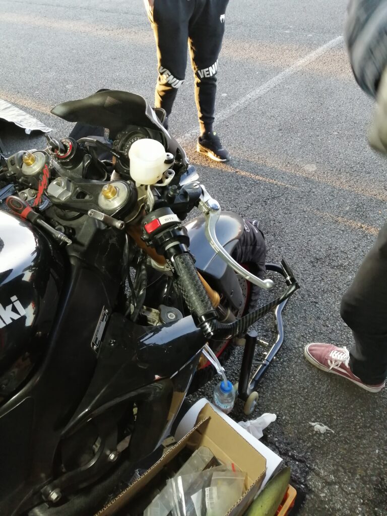 H-48h50m session chez les lents, rentrée en piste, sortie directe, la CBR broute encore plus. Ossamoual se détend peu à peu et fait le drapeau accroché au guidon de sa monture ! C’est que ça marche une ZX10 (quand c’est pas en panne) !. Nettoyage de la rampe de carbus de la Honda (on croise les doigts pour que ce soit ça, c’est compliqué de reproduire les conditions de broutage dans les paddocks et même sur route…) pendant que d’Ossamoual peint sa coque à côté… DANS LE RESPECT DES SAINTES ECRITURES. S’en suit le freinage des vis, l’enfouissement des mousses de réservoir (dont La Taupe a déjà piqué la moitié)