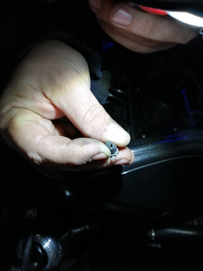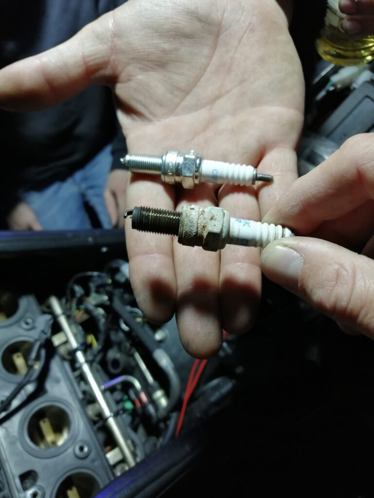 H-65 mécanique sur la Kawa : vidange du liquide de refroidissement dans une bouteille d’eau (donc sur le tapis environnemental) avant que Gixxer ne nous prête un bac, bougies avec WSC* et 20cts (quel bonheur de tomber les supports moteurs !), réparation de la bibite de dépression, changement du filtre de pompe…