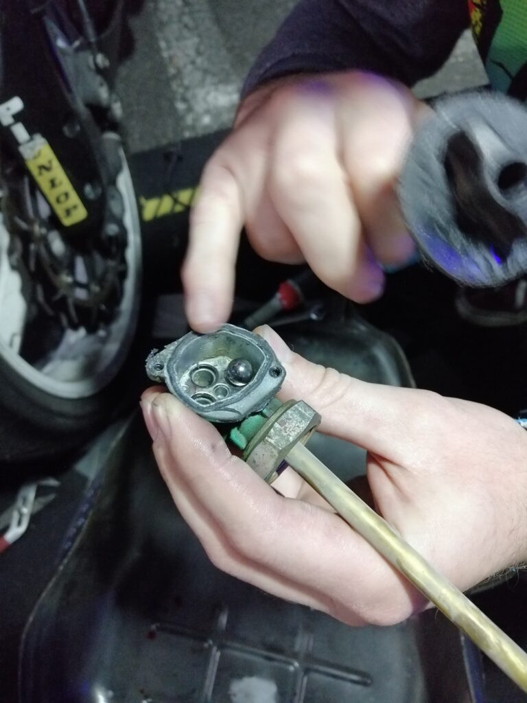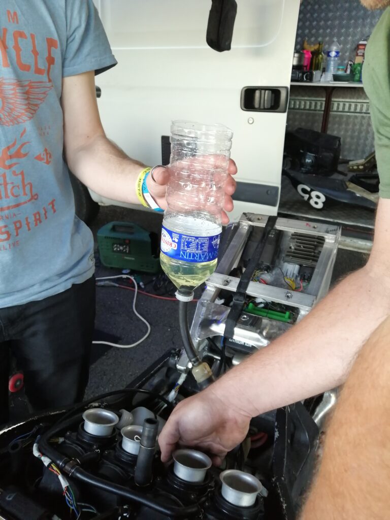 H-17 test des bobines, shunt du filtre avec une durite de Clédedix en ayant vidé l’essence du réservoir avec la pompe de 20cts dans le bidon de Zaza, vérification du robinet, les réparations de la dernière chance ! Après autopsie du filtre, on voit qu’il est quand même pas mal sale. En parallèle, Ossamoual échange avec les autres pilotes pour avoir des conseils et de nouvelles idées de trajectoires.