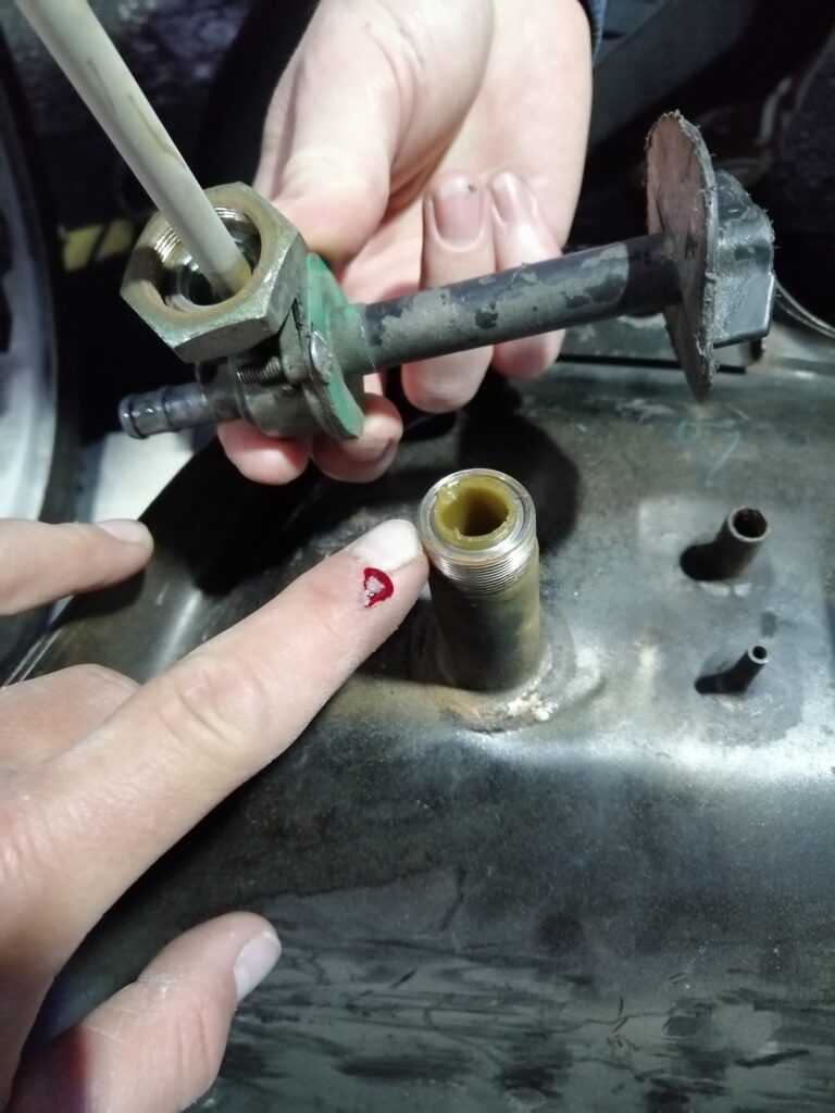 H-24 démontage du réservoir, la durite entre le filtre et la rampe paraît pincée… On coupe les durites pour éviter les coudes.